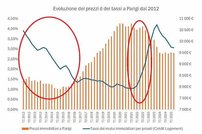 Tra il 2011 e il 2015, i tassi sono diminuiti continuamente e, tuttavia, i prezzi a Parigi sono scesi di circa il 6%. Al contrario, tra il primo trimestre 2022 e il primo trimestre 2023, i tassi sono passati dall’1% al 3%,ma i prezzi sono comunque aumentati dell’ 1,5%. Infine, tra il 2024 e il 2025, i tassi sono diminuiti di circa l’1%, senza che ciò rilanciasse davvero i prezzi, che si sono semplicemente stabilizzati.